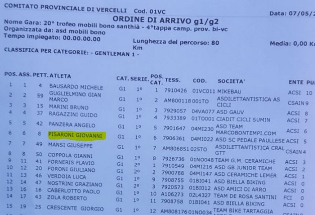 Oggi vittoria assoluta di Giovanni Pisaroni a Pozzuolo Martesana. Dopo vari tentativi che hanno visto il coinvolgimento di Pisaroni, Ghelfi ed Espen, a pochi chilometri dall'arrivo ennesimo tentativo che si rivelerà quello buono. Tra i fuggitivi Gianni Pisaroni. Volata ristretta nella quale Gianni si impone su tutti gli avversari, secondo Panzera, mentre III° arriva Piacentini.